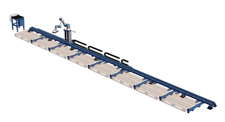 ▲UR+Vention水平軸:一次可堆垛8個托盤的水平通道系統(tǒng)。