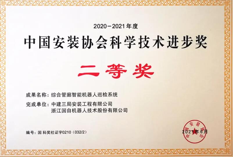 6月24日,中國安裝協(xié)會第六屆科學(xué)技術(shù)委員會會議在南京召開,會上頒布了2020-2021年度中國安裝協(xié)會科學(xué)技術(shù)進(jìn)步獎名單,由中建三局安裝工程有限公司和浙江國自機(jī)器人技術(shù)股份有限公司共同完成的“綜合管廊智能機(jī)器人巡檢系統(tǒng)”榮獲二等獎。