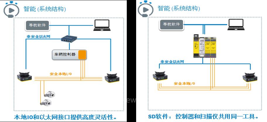 ? 借助SICK安全大腦- Flexi Soft控制系統(tǒng),可將安全組件(例如安全掃描儀、編碼器)集成為一整套安全解決方案,并可無縫集成至AGV控制系統(tǒng)。