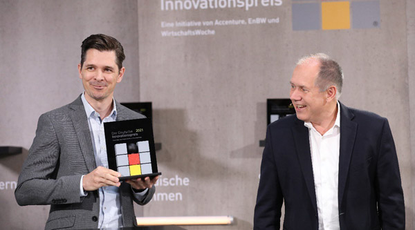 博世力士樂(lè)公司自動(dòng)化和電氣控制事業(yè)部負(fù)責(zé)人Philipp Guth代表領(lǐng)取2021年德國(guó)創(chuàng)新獎(jiǎng)。