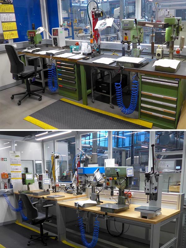 新舊稱重石桌——新的解決方案更加靈活,既減少了背部壓力,又使天平更容易操作,員工可以站著或坐著工作。