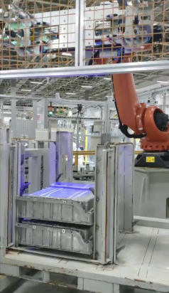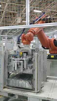 一汽-大眾新能源電池車間位于一汽-大眾長春工廠,用于電池殼體與電池包的裝配,新能源電池生產(chǎn)線實現(xiàn)了高度自動化生產(chǎn)。其中,電池殼自動上料工位采用機器人來實現(xiàn)電池殼體的自動抓取。電池殼裝載在來料小車上,每個小車裝四層電池殼體,機器人抓取電池殼體,然后放到托盤工裝,進行下一步的生產(chǎn)準備。