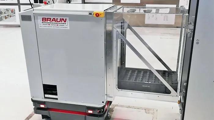 Braun Sondermaschinen GmbH 公司開發(fā)了一種名為 BS Trayshuttle 的自主移動機(jī)器人,該機(jī)器人可以從一臺托盤搬運(yùn)機(jī)器上自動拾取成堆的小型載重車或托盤,并將它們放在另一臺托盤搬運(yùn)機(jī)器上。