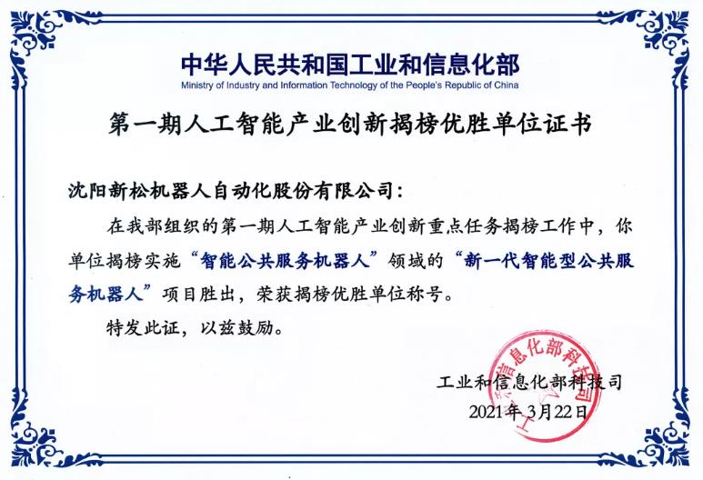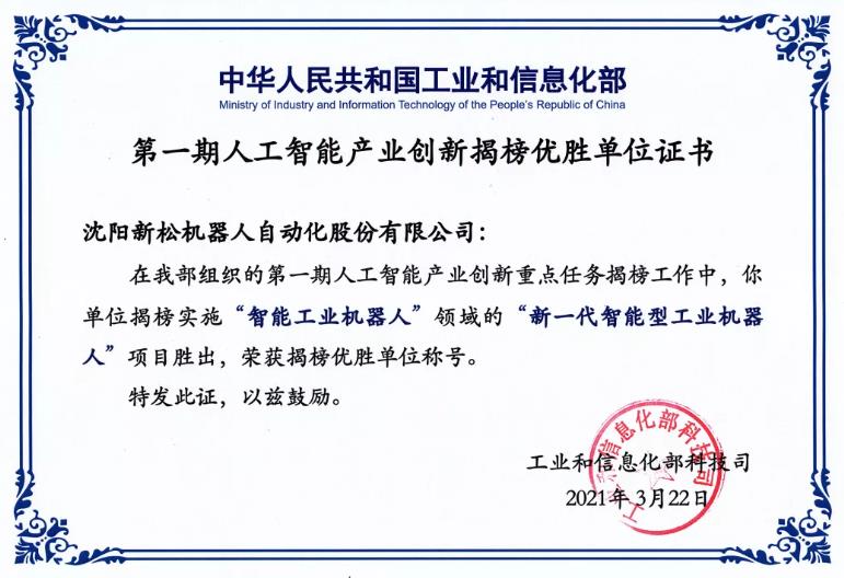 新松榮獲工信部第一期人工智能產(chǎn)業(yè)創(chuàng)新揭榜優(yōu)勝單位稱號