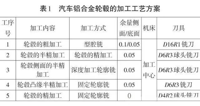 鋁合金輪轂毛坯采用鍛造工藝, 零件毛坯基本已經(jīng)成型, 只需要進(jìn)行對(duì)輪輞和輪輻的設(shè)計(jì), 根據(jù)輪輞和輪輻尺寸和造型的不同完成加工, 定位采用以輪轂底面為基準(zhǔn), 以輪轂頂面中心為加工坐標(biāo)系, 并作為Z0的起點(diǎn)位置, 用專用夾具進(jìn)行裝夾, 用百分表完成汽車鋁合金輪轂的X、 Y方向的找正。加工工序步驟是先進(jìn)行粗加工, 再進(jìn)行半精加工和精加工。主要的加工工序安排如下:粗加工型腔銑→半精加工型腔銑→精加工深度加工輪廓銑→精加工固定輪廓銑, 采用螺旋下刀的走刀方式, 避免跳刀和空走刀加工。汽車鋁合金輪轂主要是由曲面和圓弧面組成。鋁合金輪轂采用高速鎢鋼刀進(jìn)行加工, 刀具選用 ? 16R1mm、? 6R3mm、 ? 4R2mm和 ? 1R0.5mm的圓角刀和球頭刀。粗加工為了加工效率可以選用 ? 16R1mm的機(jī)夾刀,刀粒磨損安裝新刀片比較快捷方便。半精加工和精加工采用球頭刀加工, 可以達(dá)到很高的表面粗糙度。加工思路是先通過(guò)型腔銑進(jìn)行粗加工,側(cè)留0.1mm加工余量, 底面留0.05mm的余量。加工工藝方案如表1所示,再利用深度加工輪廓銑和固定輪廓銑進(jìn)行半精加工和精加工。避免振動(dòng)可采用較小的吃刀量為0.5mm,主軸轉(zhuǎn)速選取4,500轉(zhuǎn)/min, 進(jìn)給率2,500mm/min, 精加工主軸轉(zhuǎn)速選取5,500轉(zhuǎn)/min, 進(jìn)給率2,800mm/min, 吃刀量采用為0.4mm。具體切削用量明細(xì)表如表1所示 。