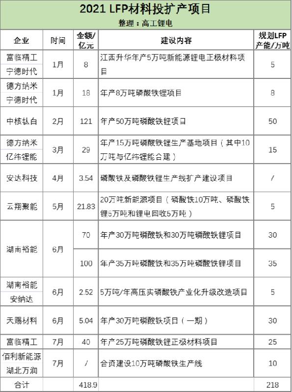 據(jù)高工鋰電不完全統(tǒng)計(jì),2021年以來,新增項(xiàng)目規(guī)劃產(chǎn)能超200萬噸LFP材料,總投資規(guī)模超400億元。