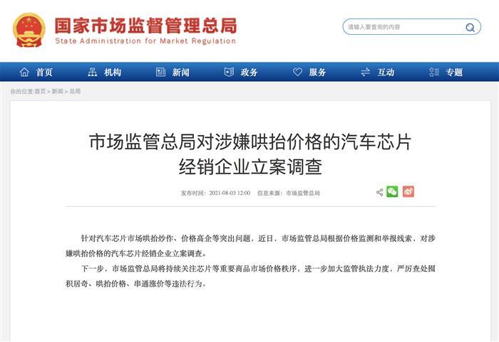 8月3日,中國市場監(jiān)管總局發(fā)步消息:針對汽車芯片市場哄抬炒作、價格高企等突出問題,近日,市場監(jiān)管總局根據(jù)價格監(jiān)測和舉報線索,對涉嫌哄抬價格的汽車芯片經(jīng)銷企業(yè)立案調(diào)查。