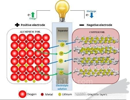 最常見的可充電電池是鋰離子電池。鋰離子電池的主要組成部分是陰極(正極)、陽(yáng)極(負(fù)極)和電解質(zhì)。大多數(shù)鋰離子電池有一個(gè)正極(陰極),由鍍?cè)阡X箔上的金屬鋰氧化物制成;一個(gè)負(fù)極(陽(yáng)極),由鍍?cè)阢~箔上的碳(例如石墨)組成(圖1)。目前有多同類型的鋰離子電池。電池材料的選擇決議了電池的性能和共同性。