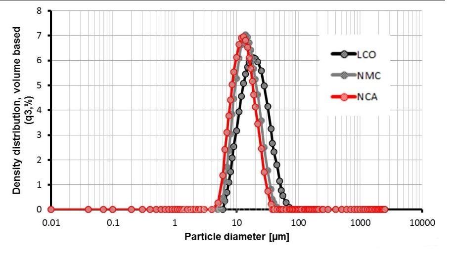 電極材料的粒度和粒度分布LCO的粒度最大,跨度最大,而NCM和NCA的平均粒度較小,分布較窄(圖3)