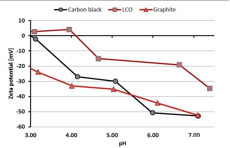圖5:炭黑、石墨和LCO的zeta電位在不同pH下的變化