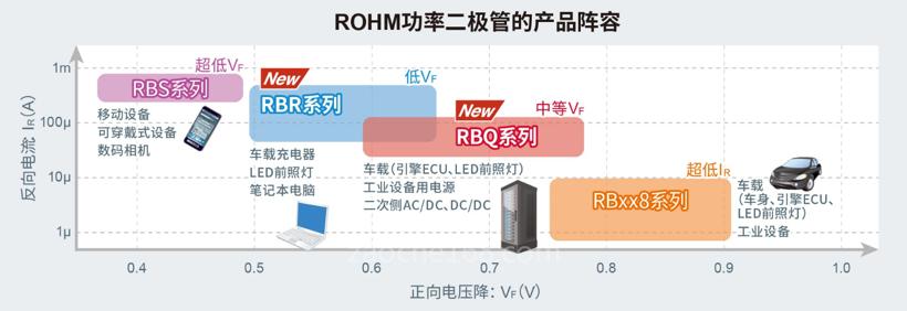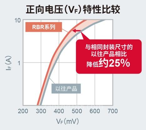 通過(guò)采用新工藝,RBR系列和RBQ系列的芯片性能都得到很大提升,與ROHM以往產(chǎn)品相比,效率提高了25%。