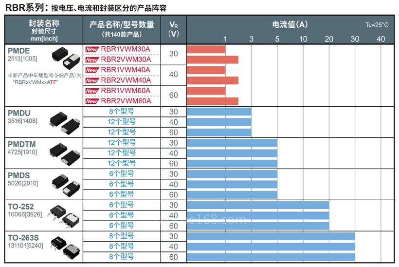 在RBR系列中,此次新增了12款 2.5mm×1.3mm的PMDE封裝產(chǎn)品(消費(fèi)電子和車(chē)載領(lǐng)域各6款)。至此,該系列已擁有共140款產(chǎn)品的豐富產(chǎn)品陣容(耐壓:30V、40V、60V;電流:1A~40A),進(jìn)一步擴(kuò)大了在車(chē)載設(shè)備和消費(fèi)電子設(shè)備領(lǐng)域的應(yīng)用范圍。