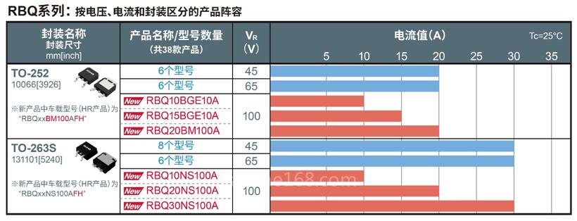 在RBQ系列中,此次新增了12款100V產(chǎn)品(消費(fèi)電子和車(chē)載領(lǐng)域各6款)。至此,包括共陰極型和單芯片型產(chǎn)品在內(nèi),該系列已擁有共38款產(chǎn)品的豐富產(chǎn)品陣容(耐壓:45V、65V、100V;電流:10A~30A)。