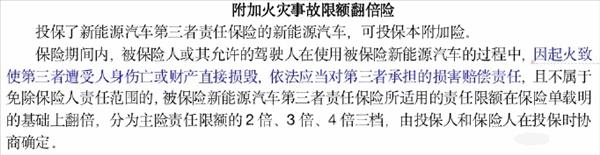 為此,針對新能源汽車的火災事故,特別推出有火災事故限額翻倍險。新能源汽車因起火只是第三者人身傷亡或者財產(chǎn)直接損毀,依法應對第三者承擔的損害賠償責任,且不屬于免除保險人責任范圍的,被保險新能源汽車第三者責任保險所適用的責任限額在保險單載明的基礎上翻倍,分為主責任限額的2倍、3倍、4倍三檔,由投保人和保險人在投保時協(xié)商確定。按照當前三責險最高1000萬元的保額來計算,新能源汽車的火災事故限額翻倍險,最高可以翻4倍,投保4千萬元的保額,滿足車主因火災賠付的理賠需求。