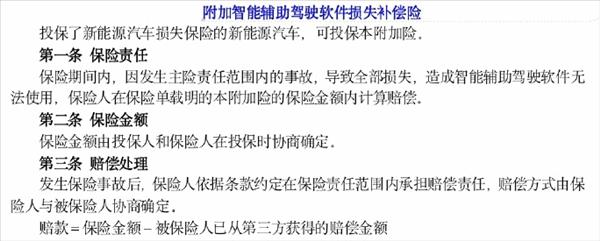 此外,意見稿中還有附加智能輔助駕駛軟件損失補償險。保險責任為,在主險責任范圍內(nèi)的事故,導致全部損失,造成智能輔助駕駛軟件無法使用,保險人在保險單載明的本附加險的保險金額內(nèi)計算賠償。也就是說,如果車輛因事故導致全損,而此前車主單獨購買的智能輔助駕駛功能無法使用(車輛全損后,保險公司回收后全額理賠),也會對其進行保險賠付。