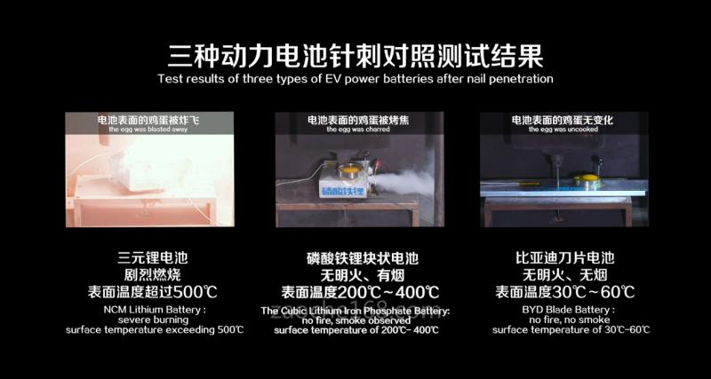 針刺測試的結(jié)果對比明顯,比亞迪刀片電池針刺后,無明火、無煙,表面溫度僅為30-60℃。普通磷酸鐵鋰電池針刺后,無明火,冒煙,表面溫度200℃-400℃。三元鋰電池針刺后,劇烈燃燒,表面溫度超過500℃。