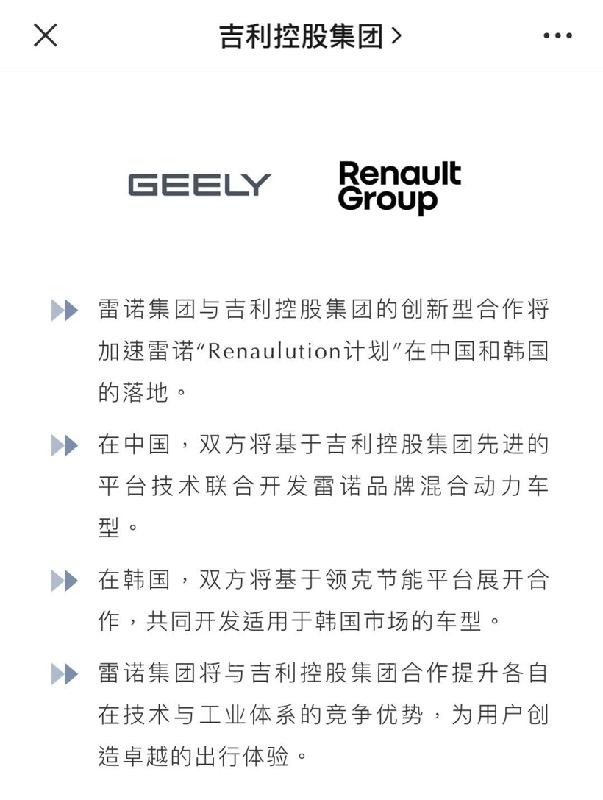 8月9日,吉利官方對(duì)外宣布,吉利控股集團(tuán)與雷諾集團(tuán)簽署諒解備忘錄 ,在中國(guó)和韓國(guó)開(kāi)展合作。
