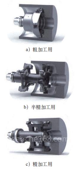 不同加工階段所用的多種減輕質量的鏜刀結構如圖2所示。粗加工階段使用ISO鏜刀,帶刀夾及PCD ISO可轉位刀片;半精加工階段使用精密鏜刀,焊接結構設計,帶PCD ISO可轉位刀片;精加工階段使用精密導條刀具,焊接結構設計,帶微調(diào)PCD可轉位刀片、支撐導條。各階段鏜刀都采用了ISO標準經(jīng)濟的適合鋁合金加工的PCD可轉位更換刀片,壽命長,加工質量高。