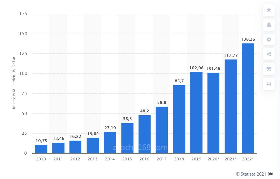 從全球市場來看,2020年SaaS市場規(guī)模已經(jīng)超過了1000億美元(見圖3)。