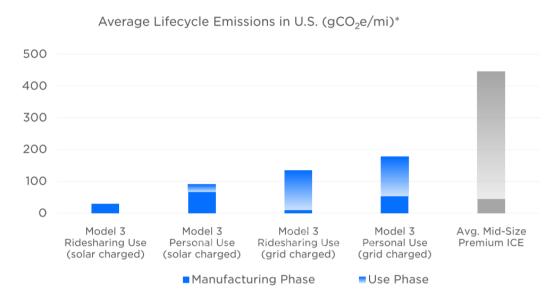2020年,特斯拉在全球范圍內(nèi)的汽車、太陽能面板使用過程中,累計(jì)節(jié)約了500萬公噸的二氧化碳當(dāng)量。這其中,全美特斯拉汽車平均二氧化碳排放當(dāng)量(包括制造和使用),如果以純電網(wǎng)充電計(jì)算,不到燃油車均值的一半;如果以太陽能充電,二氧化碳當(dāng)量更是直接降為燃油車的1/10左右。