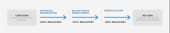 最為關(guān)鍵的,2020年第四季度,特斯拉在內(nèi)華達(dá)州超級(jí)工廠成功安裝了第一階段的電池回收設(shè)施,用于內(nèi)部處理電池制造廢料和報(bào)廢電池。整個(gè)2020年,特斯拉一共回收了1300噸的鎳、400噸的銅,以及80噸的鈷,經(jīng)過物理分解、黑塊富集、提純后,1000kWh的電池,可以回收得到等量于921kWh電池的原材料,電池原材料金屬可達(dá)到92%的再利用。特斯拉表示:從經(jīng)濟(jì)的角度來看,與大規(guī)模電池材料回收和循環(huán)利用相關(guān)的成本,遠(yuǎn)遠(yuǎn)低于購(gòu)買額外的電池制造原材料。
