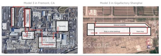 提升車輛制造環(huán)節(jié)環(huán)境友好度的一大妙招是縮短物料運(yùn)送距離,所以上海超級(jí)工廠從建設(shè)開始就對(duì)運(yùn)送環(huán)節(jié)做了優(yōu)化,遠(yuǎn)優(yōu)于60年前建造的弗洛蒙特超級(jí)工廠。