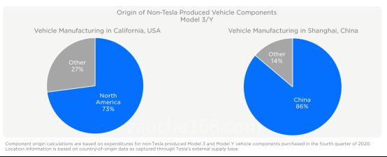 合理增加工廠數(shù)量可以減少物料和車輛運(yùn)輸距離,從而達(dá)成減排。所以特斯拉在運(yùn)營(yíng)資金大幅改善的情況下開始全球擴(kuò)張制造足跡,目前已經(jīng)形成美洲、亞洲、歐洲的工廠覆蓋;供應(yīng)鏈本地化也是減排一大利器,且對(duì)環(huán)境的幫助不僅限于減排,北美加州工廠生產(chǎn)的車型中,各部件本地化率達(dá)到了73%,而上海超級(jí)工廠的各部件的本地化率更是達(dá)到了86%。