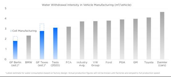 此外,特斯拉每輛車的用水量也少于絕大多數(shù)燃油汽車制造商,位列全球倒數(shù)第二。規(guī)劃中的特斯拉德克薩斯州超級(jí)工廠用水量將更低,而柏林工廠則將成為單車用水量最低的汽車工廠。