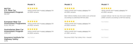 在安全方面,特斯拉車輛共獲得來自美國(guó)、歐洲和澳大利亞等安全評(píng)級(jí)機(jī)構(gòu)的20個(gè)5星評(píng)級(jí)。根據(jù)2020全年數(shù)據(jù),特斯拉自動(dòng)輔助駕駛系統(tǒng)Autopilot使用期間,平均每百萬英里(160 萬公里)僅發(fā)生 0.2 次事故,僅為全美所有車輛(包括商用車)平均百萬英里事故數(shù)2起的1/10;據(jù)美國(guó)國(guó)家消防協(xié)會(huì)和美國(guó)交通部數(shù)據(jù)顯示,美國(guó)每行駛1900萬英里就有一輛汽車發(fā)生火災(zāi),而特斯拉從2012年到2020年,大約每行駛2.05億英里有一輛汽車起火,特斯拉車輛的火災(zāi)事故率不及美國(guó)車輛火災(zāi)平均事故率的1/10。特斯拉一直致力于不斷改進(jìn)電池成分、電池結(jié)構(gòu)、電池組結(jié)構(gòu)等,以盡可能地將火災(zāi)風(fēng)險(xiǎn)降低到零。
