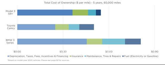 在擁有成本和使用成本方面,以5年6萬英里(9.6 萬公里)的總擁有成本為例,Model 3平均每英里花費(fèi)僅比凱美瑞略高,遠(yuǎn)低于寶馬3系。而Model 3的使用成本,僅僅是略高于凱美瑞等車型的一半,盡管Model 3對(duì)標(biāo)寶馬、奧迪等高端車型,但因?yàn)檐囕v維護(hù)成本和電力成本較低,其使用成本遠(yuǎn)低于同級(jí)別燃油汽車。