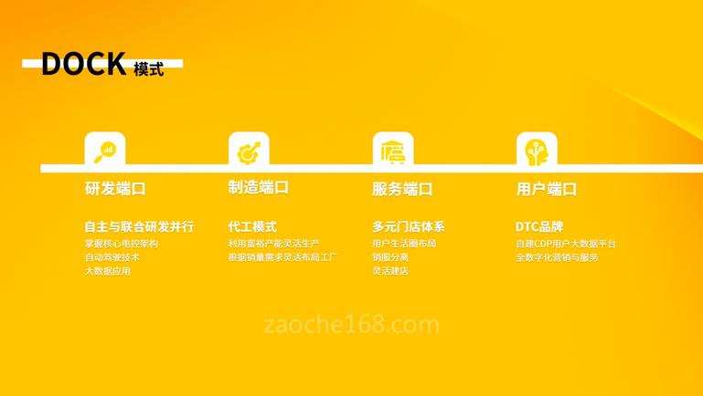 DOCK商業(yè)模式,針對汽車重資產(chǎn)與高成本的行業(yè)痛點,以更輕量化、更靈活、更快速的方式發(fā)展。重慶新特汽車將成為專注核心技術研發(fā)、直面用戶運維、快速應對市場的大腦,直連當下成熟的新能源產(chǎn)業(yè)鏈,高效靈活地利用各類技術、生產(chǎn)及服務資源,為用戶帶來高性價比的產(chǎn)品與服務。