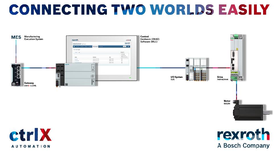 信息技術(shù)(IT)和運(yùn)營技術(shù)(OT)一向都各自獨(dú)立,分屬兩個不同的世界。但如今,時代已大不相同。面對不斷變化的市場需求,制造商必須以更靈活、更迅速的方式做出反應(yīng),以便在短時間內(nèi)對生產(chǎn)做出調(diào)整。如果為實(shí)現(xiàn)此目的所需要的數(shù)據(jù)是存儲在不兼容的獨(dú)立系統(tǒng)中,便只能通過復(fù)雜的手動干預(yù)才能做出更改。而ctrlX CORE 作為網(wǎng)關(guān),可以在生產(chǎn)層面上為IT系統(tǒng)(例如MES)和OT系統(tǒng)架起一座橋梁。采用這一解決方案,用戶便可以安全地將來自MES的數(shù)據(jù)直接發(fā)送給機(jī)器控制系統(tǒng)。其結(jié)果是,無需額外干預(yù)即可針對不斷變化的條件做出反應(yīng)。