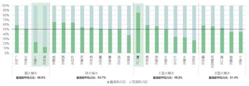 隨著居民對(duì)直流快充服務(wù)訴求的提高,公用樁的供給結(jié)構(gòu)開始向直流快充樁方向側(cè)重。25座城市中心城區(qū)的直流公用樁占比均值接近50%,15座城市的直流公用樁占比超過(guò)50%。