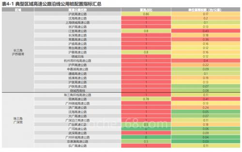 在分布密度方面,長(zhǎng)三角滬蘇錫常區(qū)域的高速公路沿線單位里程配置的公用樁數(shù)達(dá)到0.13臺(tái)/公里,是珠三角廣深莞區(qū)域的2倍。其中,滬蘇錫常區(qū)域中的江宜高速、杭州灣環(huán)線高速單位里程樁數(shù)超過(guò)了0.4臺(tái)/公里;廣深莞區(qū)域僅有莞佛高速的單位里程樁數(shù)超過(guò)了該值。同時(shí),滬蘇錫常區(qū)域的滬陜高速單位里程公用樁配置密度低于0.07臺(tái)/公里,廣深莞區(qū)域的大廣、沈海、廣河等5條高速單位里程公用樁配置密度低于該值。
