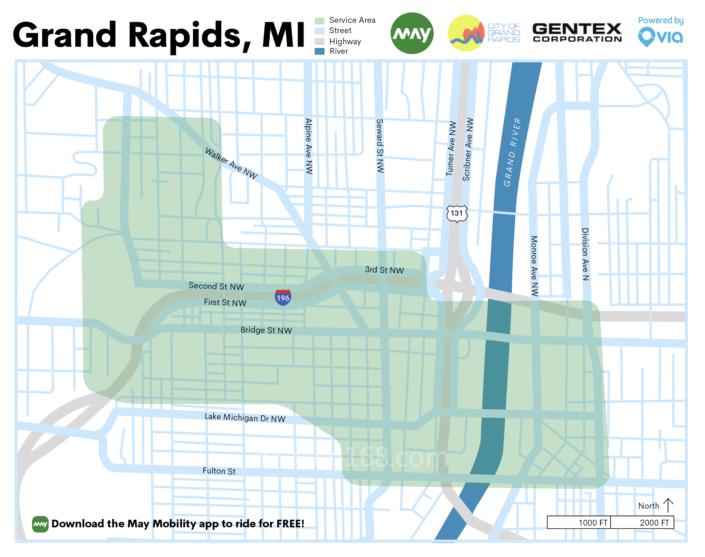 該按需服務(wù)包括四輛May Mobility雷克薩斯RX450h和一輛搭載May Mobility自動駕駛技術(shù)的殘疾人專用Polaris GEM。此項服務(wù)的運營區(qū)域為1.36平方英里,包括大急流城市中心20多個指定的接送區(qū)。這些May Mobility AV接駁車可免費乘坐,運營時間為周一至周五上午7點至晚上7點。