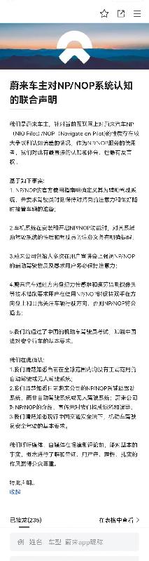 8月18日,有博主在社交平臺(tái)上披露了一則蔚來車主對NP/NOP系統(tǒng)認(rèn)知的聯(lián)合聲明,該博主表示,聯(lián)合聲明系蔚來車主自發(fā),目前已有500人參與聯(lián)合聲明。對此消息,蓋世汽車向蔚來官方求證,但未收到回復(fù)。