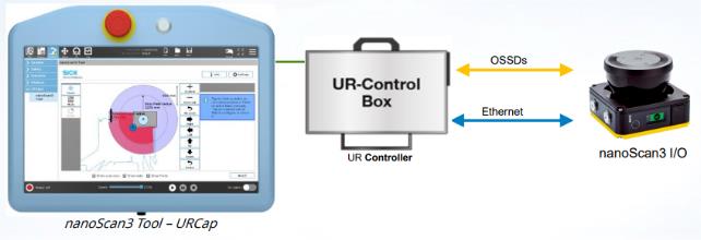 nanoScan3直接連接UR機(jī)器人控制器,安全系統(tǒng)所有的參數(shù)配置及診斷信息通過UR機(jī)器人示教器來進(jìn)行配置和顯示。