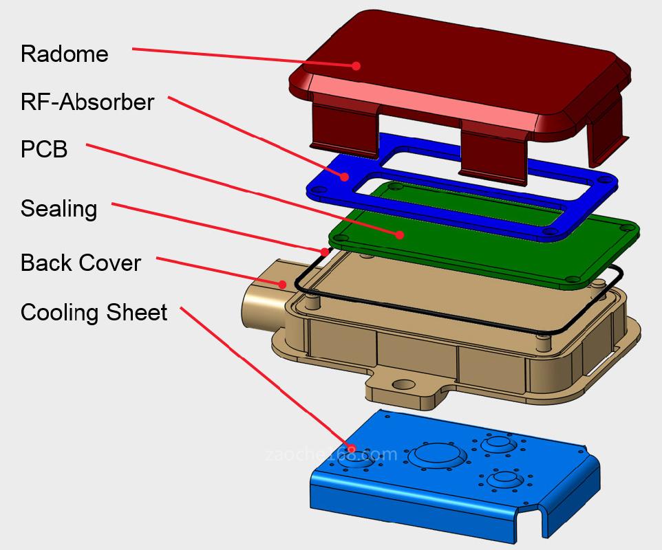 朗盛新概念包括以下單個(gè)組件:前蓋(天線罩);雷達(dá)吸波器;印刷電路板(PCB),包括天線;和帶有集成冷卻元件的后蓋。天線罩由塑料制成,背對(duì)車(chē)輛,可高度傳輸雷達(dá)波。而聚對(duì)苯二甲酸丁二醇酯(PBT)具有較低的介電常數(shù)(Dk)和損耗因子(Df),因此非常適合這種應(yīng)用。