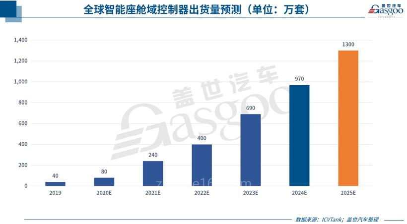 ICVTank數(shù)據(jù)顯示,2019年全球智能座艙域控制器出貨量為40萬套,預(yù)計(jì)2025年全球智能座艙域控制器出貨量將達(dá)到1300萬套。