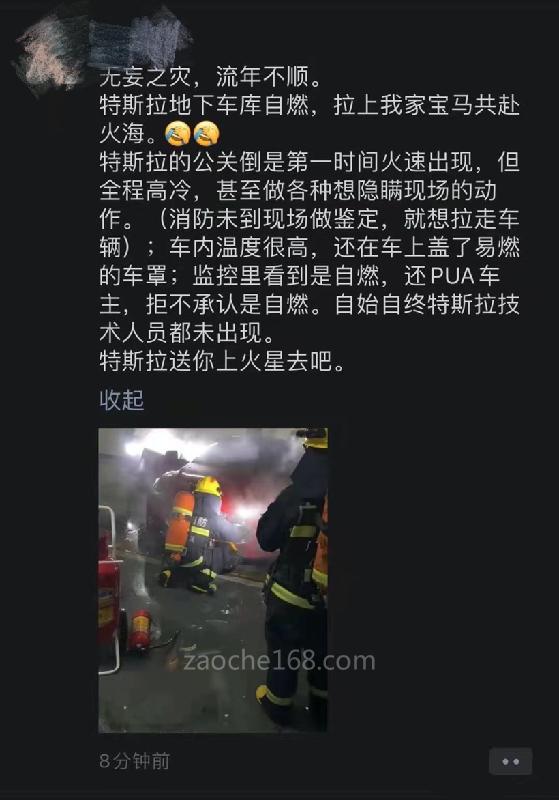 之后一位寶馬7系車主在個人社交平臺上發(fā)文表示,因為自己的車臨近特斯拉,也因此受到波及,“無妄之災(zāi),流年不利。特斯拉地下車庫自燃,拉上我家寶馬共赴火海。”