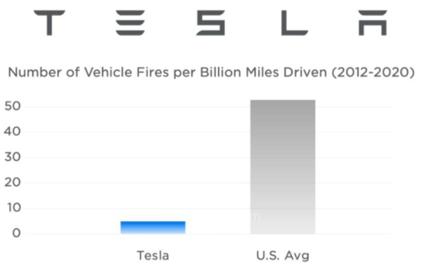 具體來看,從2012年到2020年,美國國家消防協(xié)會和美國交通部的數(shù)據(jù)顯示,全美每行駛1900萬英里就有一輛汽車發(fā)生火災(zāi)。而特斯拉發(fā)生起火事件的頻率是2.05億英里/次。