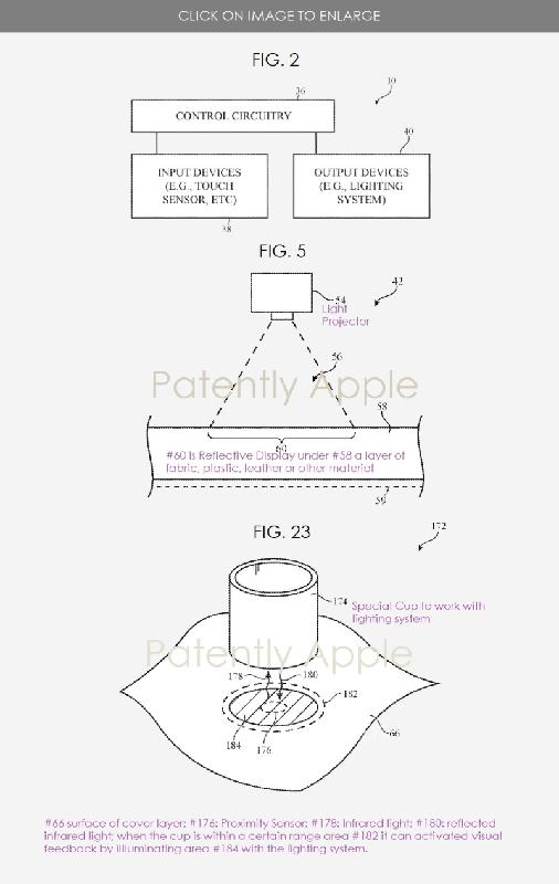 蘋果專利圖2是一個(gè)照明系統(tǒng)示意圖,圖5是光投影系統(tǒng)的側(cè)視圖,如用于提供照明的圖像投影儀等。蘋果專利圖23是透視圖,展示了一個(gè)用于放杯子和相關(guān)照明系統(tǒng)等物品的磁性支架。