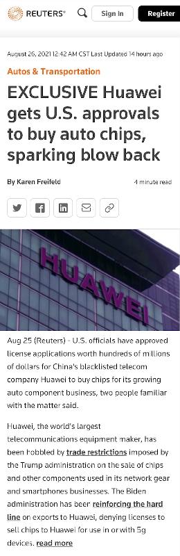 據(jù)路透社報道,據(jù)兩名知情人士透露,美國方面已批準(zhǔn)華為公司為其不斷增長的汽車零部件業(yè)務(wù)購買芯片的許可證申請,價值數(shù)億美元。