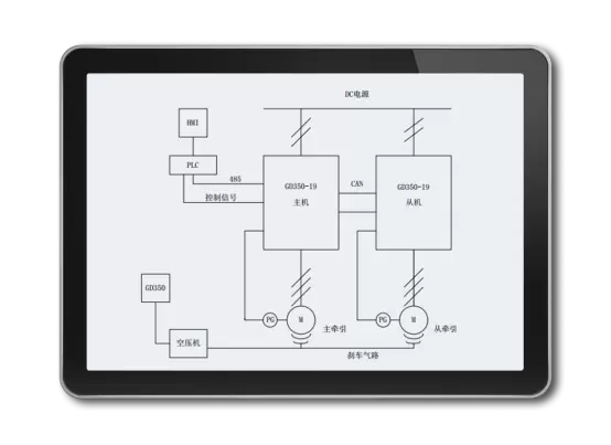 驅(qū)動(dòng)方式:主牽引采用GD350-19變頻器一拖一電機(jī),使用閉環(huán)矢量模式運(yùn)行,電機(jī)側(cè)安裝編碼器,將運(yùn)行頻率反饋至變頻器實(shí)現(xiàn)閉環(huán)矢量控制;空壓機(jī)采用GD350變頻器驅(qū)動(dòng),系統(tǒng)上電后直接運(yùn)行,保證剎車用氣供給;