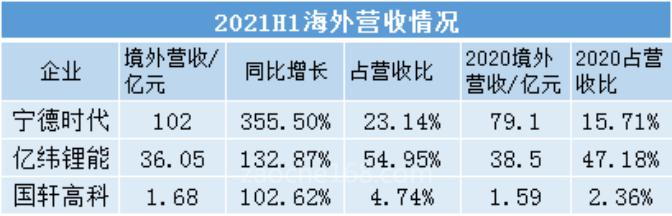 近期,各大動力電池企業(yè)相繼披露半年報。高工鋰電注意到,寧德時代、國軒高科、億緯鋰能2021年上半年境外營收出現(xiàn)翻倍式增長,同比增速在1~3.5倍,境外營收接近或已超過2020年全年。