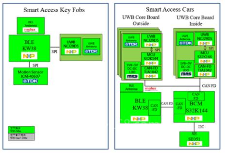 本方案主要分為5部分,即:鑰匙端、車身錨點(diǎn)、車內(nèi)錨點(diǎn)、基站藍(lán)牙和BCM,其中,鑰匙端由BLE KW38 + UWB NCJ29D5組成。NCJ29D5是NXP推出的新一代超寬帶(UWB)IC系列的第一款產(chǎn)品,專用于滿足全球汽車業(yè)的連接和功能安全需求。UWB IC使汽車準(zhǔn)確識(shí)別用戶位置,定位誤差精確到厘米級(jí)別。這可為基于智能手機(jī)的汽車接入技術(shù)提供與一流遙控鑰匙相同的便利性。用戶將手機(jī)放在口袋或包中便能夠打開和啟動(dòng)汽車,并通過智能手機(jī)享受安全的遠(yuǎn)程泊車服務(wù)。此外,新的UWB IC還可最大限度地防止通過中繼攻擊盜車的風(fēng)險(xiǎn)。