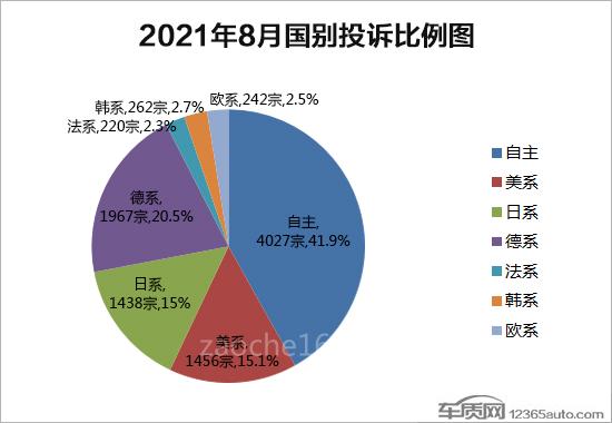 本月,除自主、日系和歐系品牌外,其余各國別品牌投訴量環(huán)比均有所下降。其中德系品牌降幅相對較大,投訴量再次回落至2000宗以下,環(huán)比下降11.4%。歐系品牌成為本月投訴量漲幅最大的國別品牌,較7月份上漲14.2%,投訴增量多來自于部分斯柯達品牌車型。