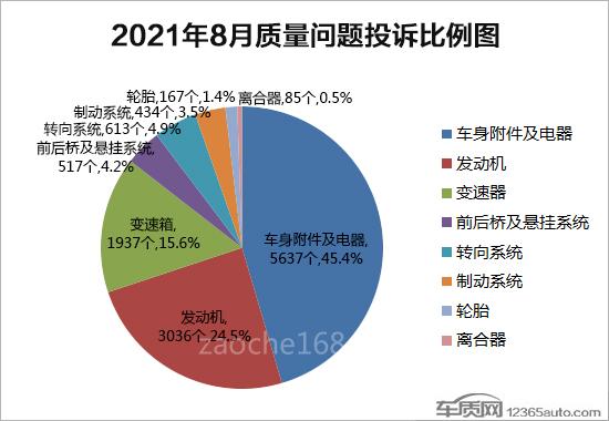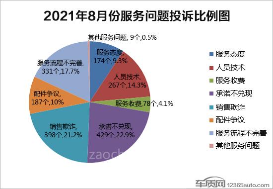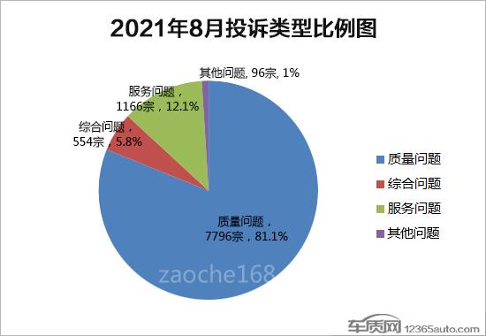 車質(zhì)網(wǎng)受理的投訴主要分為質(zhì)量問題、服務問題、綜合問題以及其他問題四大類。2021年8月,單純質(zhì)量問題的投訴量和投訴占比較7月份均有所回落,但投訴占比仍超過八成。本月服務問題投訴量連續(xù)第二個月突破千宗,創(chuàng)造年內(nèi)月投訴量最高紀錄,與部分自主品牌車型投訴量異常增多有關。