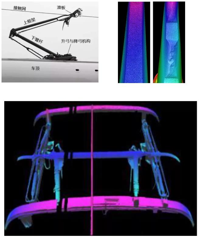 受電弓是電力牽引機(jī)車從接觸網(wǎng)取得電能的電氣設(shè)備,安裝在機(jī)車或動車車頂上。主要檢測內(nèi)容:完成受電弓的外形尺寸輪廓及磨損檢測。