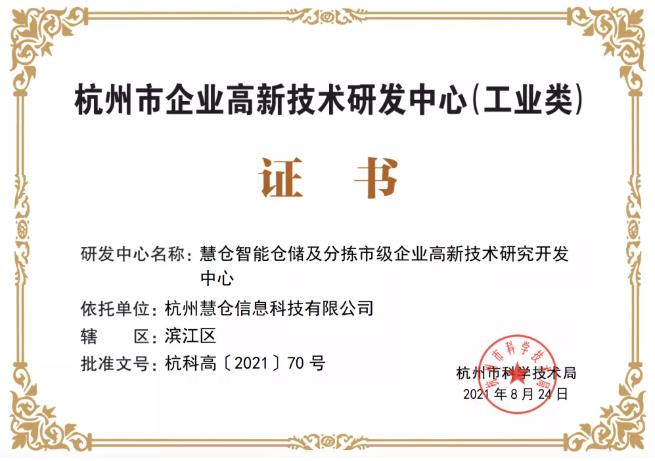 近日,杭州市科學(xué)技術(shù)局正式下發(fā)《關(guān)于認(rèn)定2021年杭州市企業(yè)高新技術(shù)研究開(kāi)發(fā)中心的通知》,根據(jù)《杭州市企業(yè)高新技術(shù)研究開(kāi)發(fā)中心管理辦法》,經(jīng)企業(yè)自主申報(bào)、專(zhuān)家評(píng)審、現(xiàn)場(chǎng)考察和推薦公示,杭州慧倉(cāng)信息科技有限公司已成功認(rèn)證為2021年杭州市企業(yè)高新技術(shù)研究開(kāi)發(fā)中心。